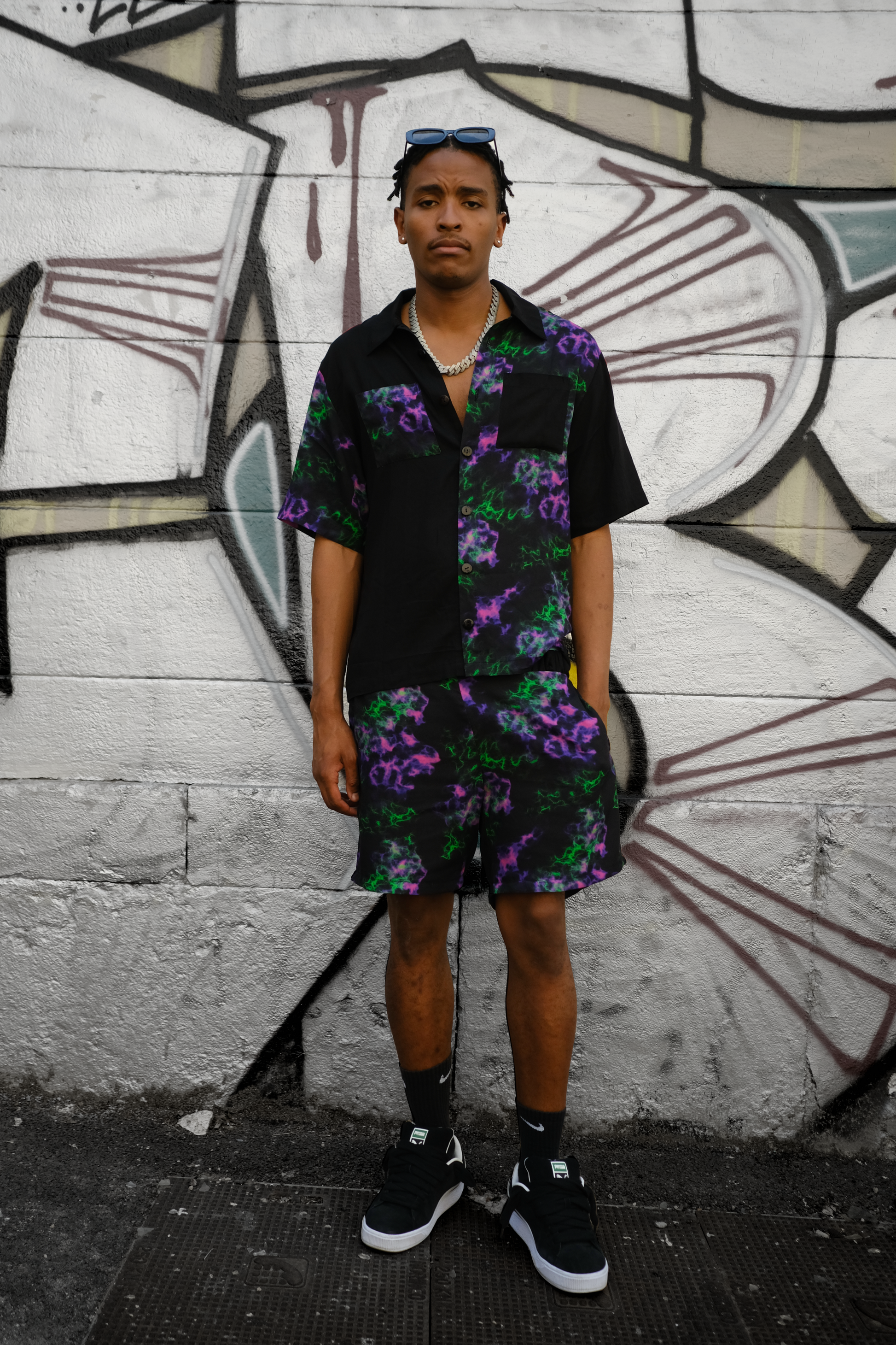 Cette chemise à manches courtes est en viscose noire et multicolore, un tissu léger écoresponsable, provenant directement de notre fournisseur en Indonésie.